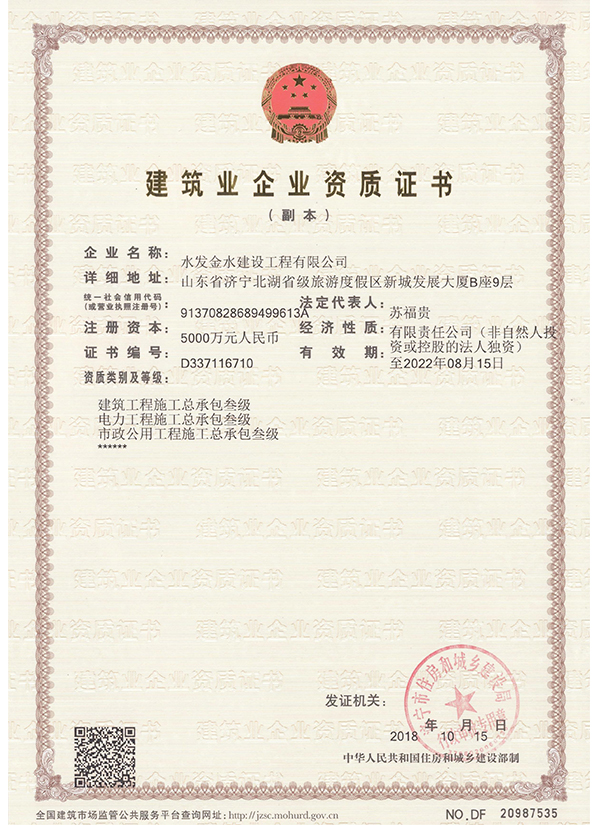 水發(fā)金水建設(shè)工程有限公司 建筑、電力、市政資質(zhì)證書