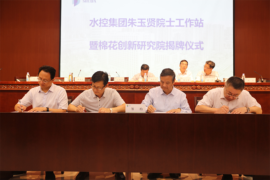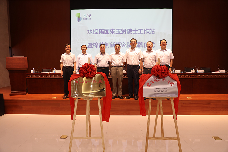 隨后,朱玉賢、潘軍、劉肖軍、吳東振、王西奎、劉琦、楊丙生一同為水控集團朱玉賢院士工作站和棉花創新研究院揭牌。