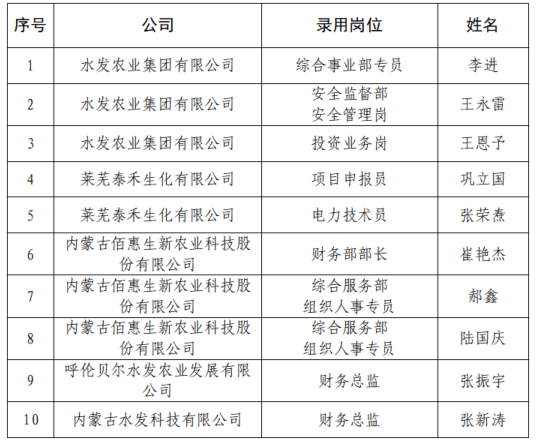 根據(jù)《水發(fā)集團(tuán)有限公司社會招聘公告》及有關(guān)要求,經(jīng)報(bào)名、資格審查、筆試、面試等程序及集團(tuán)黨委會研究,擬錄用李進(jìn)等10名人選(名單見附件),現(xiàn)予以公示。